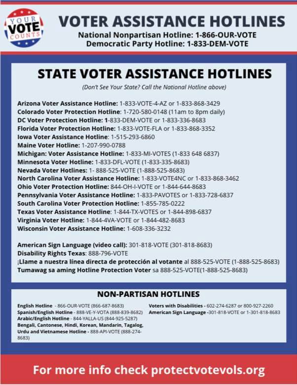 These are the main hotlines for voter protection and reporting intimidation. They’re staffed up and ready to roll. If you see any problems, call these first! And share the heck out of this image.